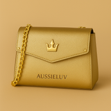 Make every entrance unforgettable with the AUSSIELUV Gold Crown Party Bag — where timeless elegance meets bold modern glamour. Wrapped in a dazzling metallic gold pebbled leather, this structured silhouette is crowned with a signature gold emblem and the iconic AUSSIELUV branding, inside and out.