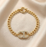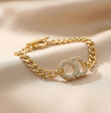 Crafted with a sleek gold-tone chain and finished with a sparkling pavé emblem, this bracelet brings effortless sophistication to any look. The bold yet balanced silhouette makes it perfect for solo wear or stacking with your favourite pieces. From workdays to weekends, this is luxury you’ll reach for again and again.